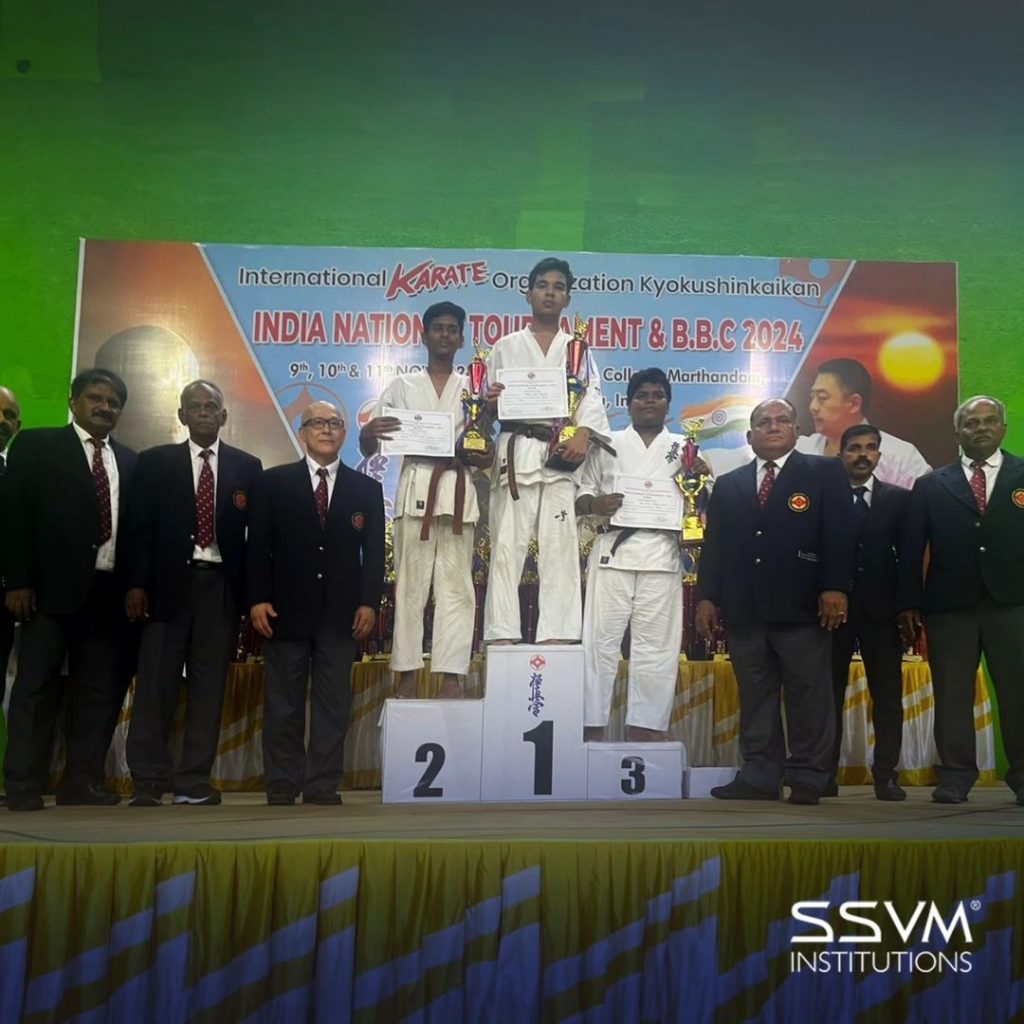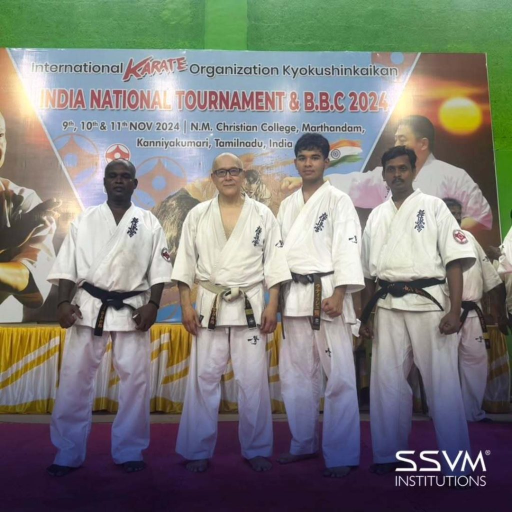 SSVM® World School is proud to announce that Aditya Ken Ratheesh of Grade 9 has represented the Coimbatore region with exceptional skill and sportsmanship at the prestigious India National Karate Tournament 2024, conducted by the International Karate Organization, Kyokushikaikan. This national tournament, held in Kanyakumari from 9th to 11th November, witnessed fierce competition among top karatekas from across the country.