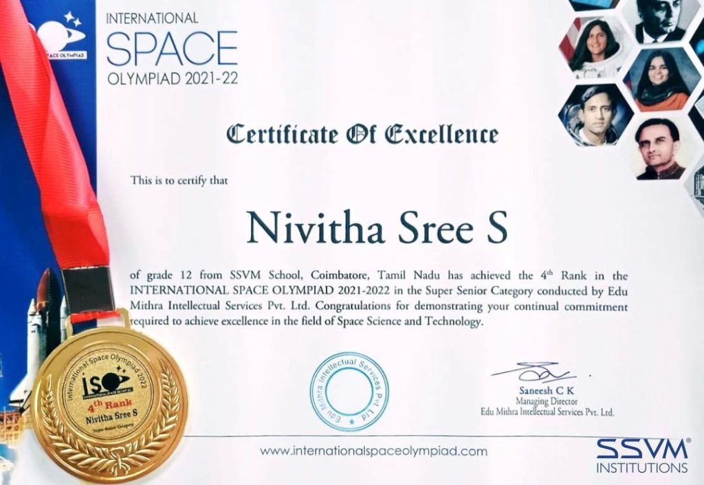 At SSVM, we believe in nurturing our students with the environment and opportunities they need to succeed from a young age. We are proud to share that our student Nivitha Shree of Grade 12 has achieved an impressive 4th rank at the International Space Olympiad.