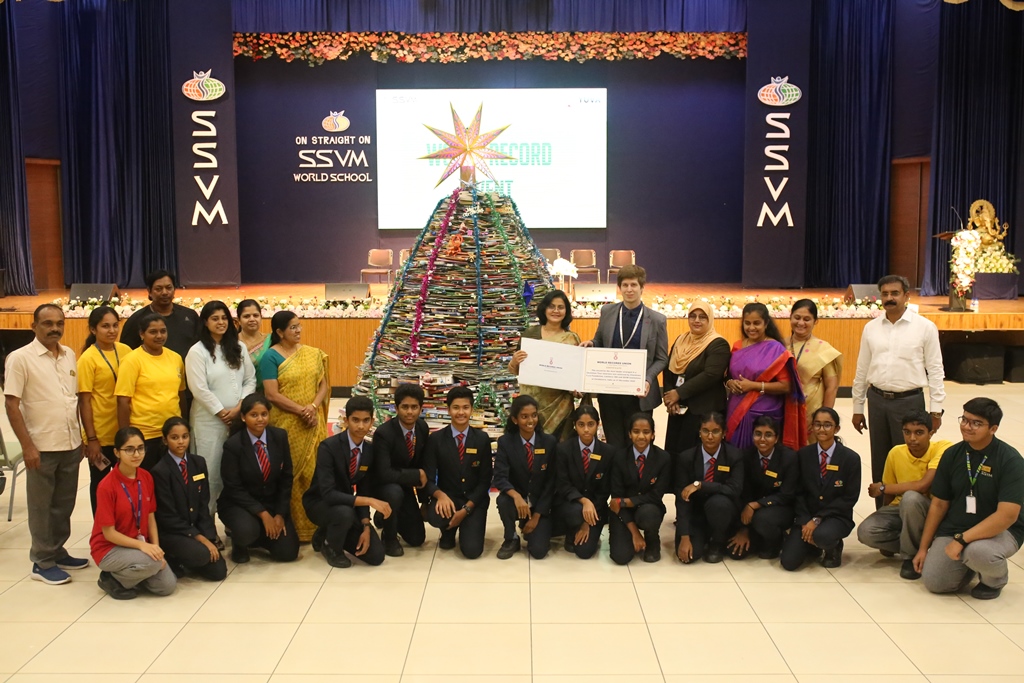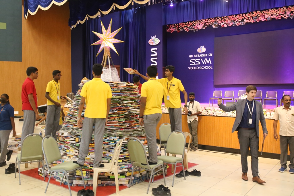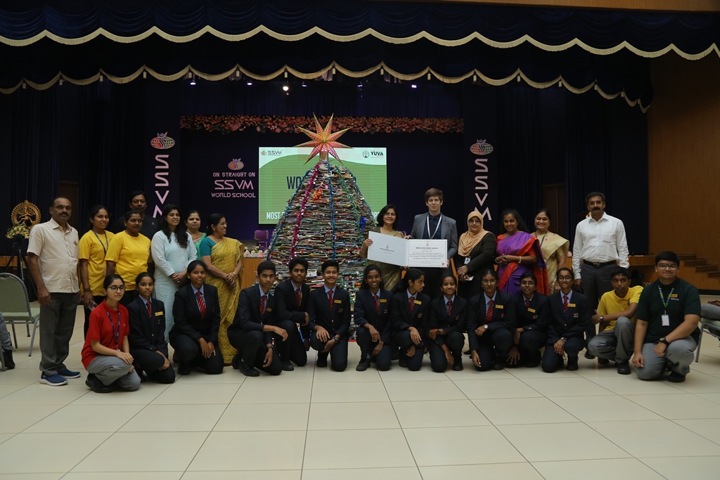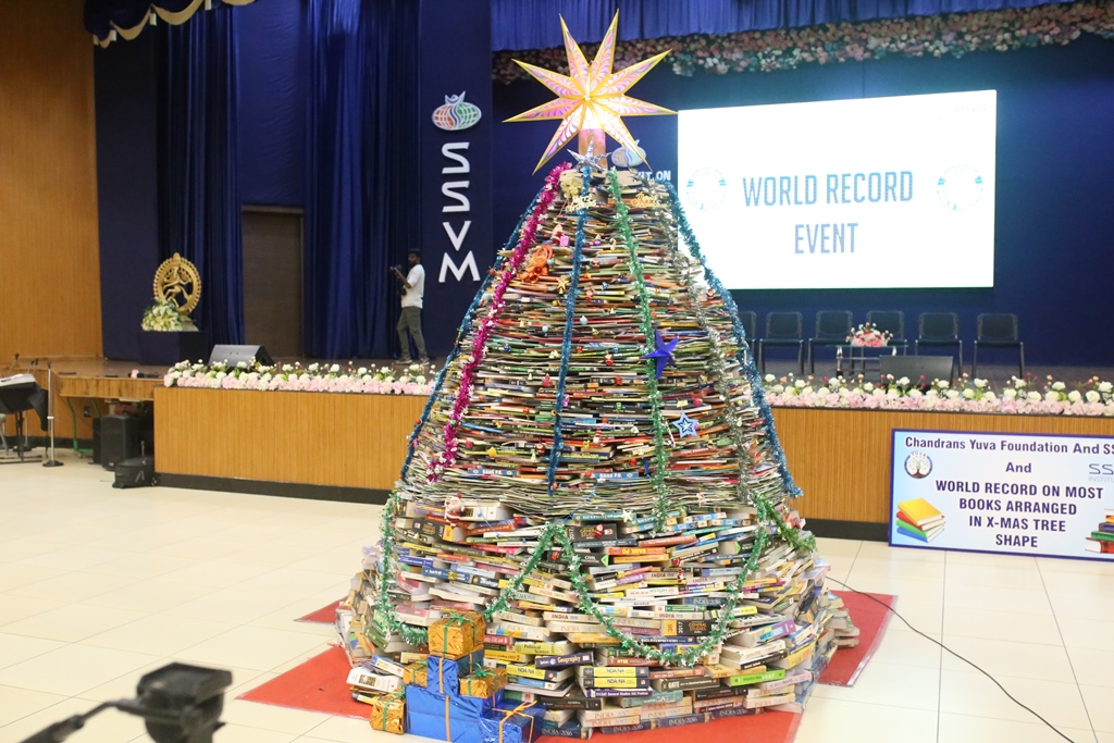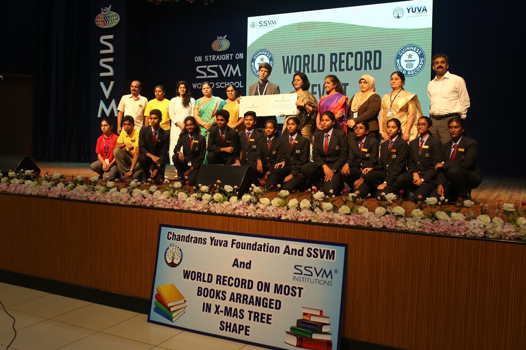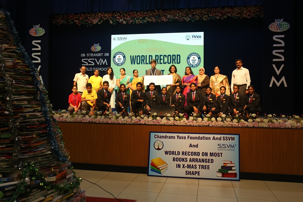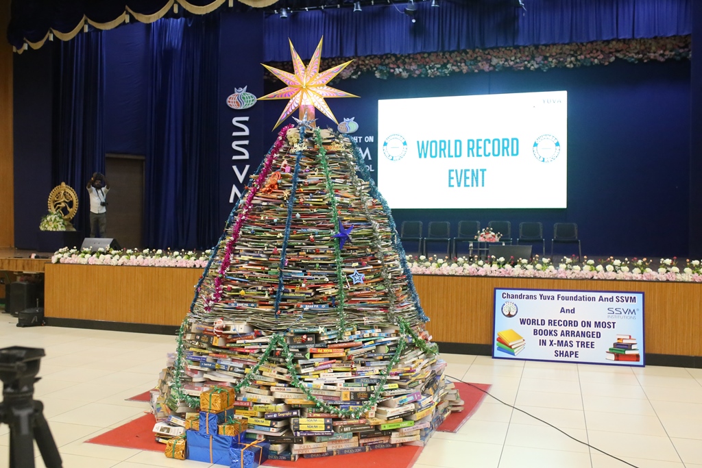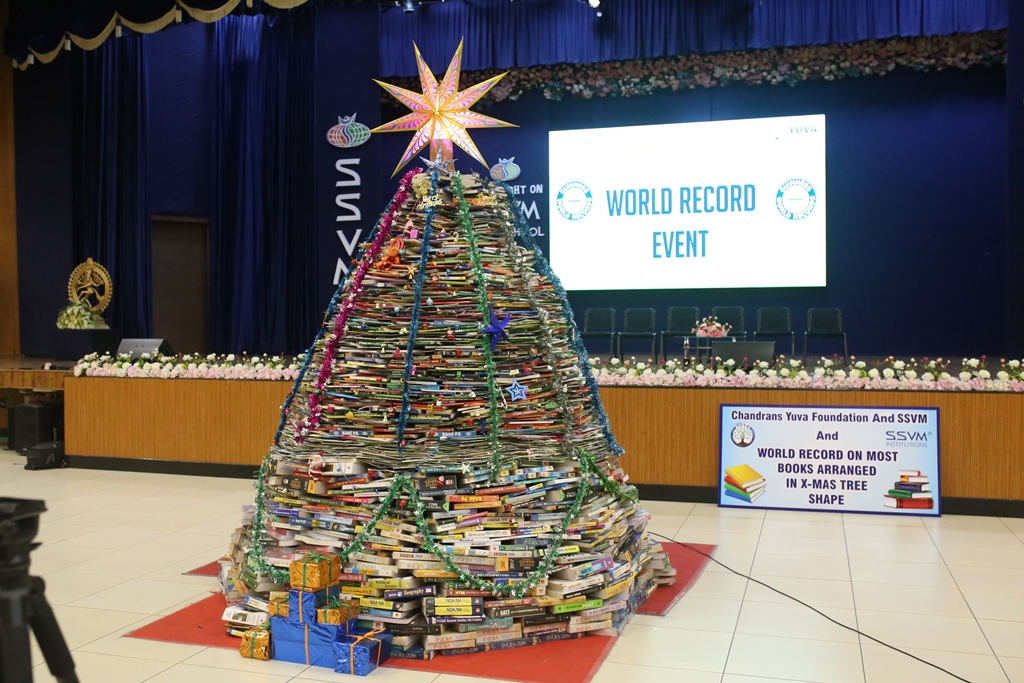SSVM Institutions’ Yuva Club set a World Record Chirstofer Taylor Craft presents the record certificate to Manimekalai Mohan in the presence of Chandrans Yuva Foundation members and the student participants. Chandrans Yuva Foundation & Yuva Club students of SSVM World School came together to structure a 15 feet tall Christmas Tree look alike using 12,000 books in 1.5 hours and successfully set a World Record at the school premises.Chirstofer Taylor Craft from World Records Union, Florida judged the attempt and handed over the official world record certificate to the Yuva Club Students of the school in a ceremony.