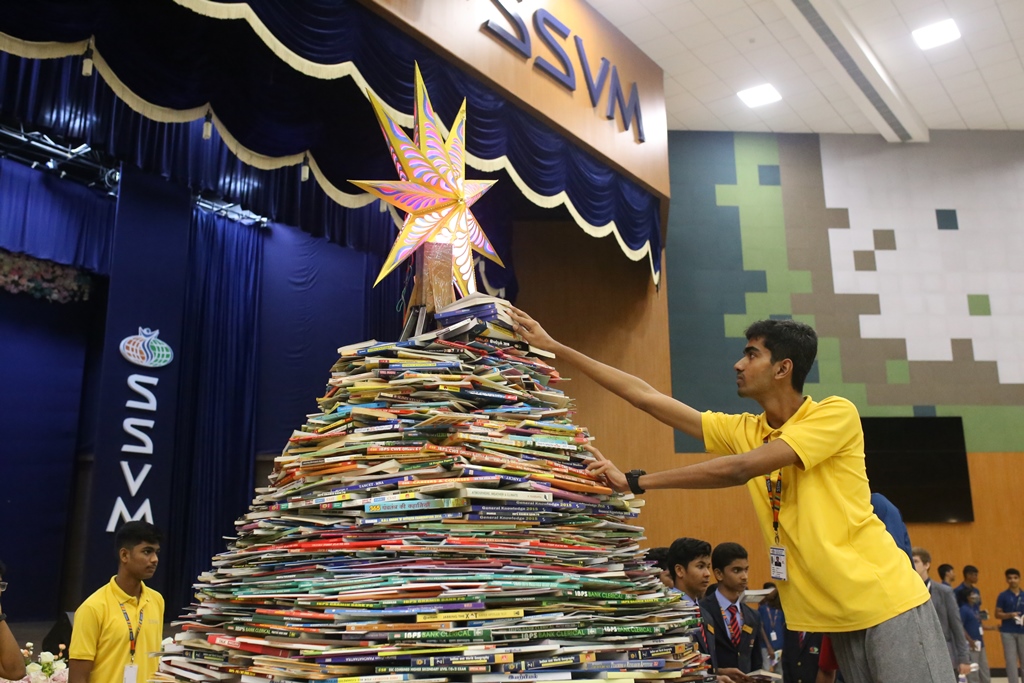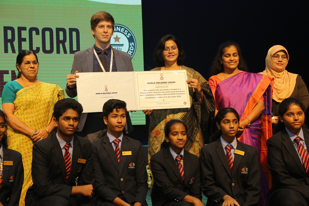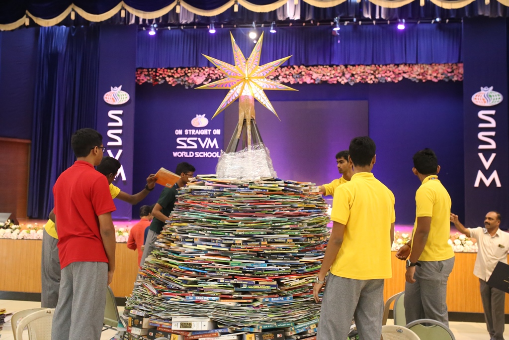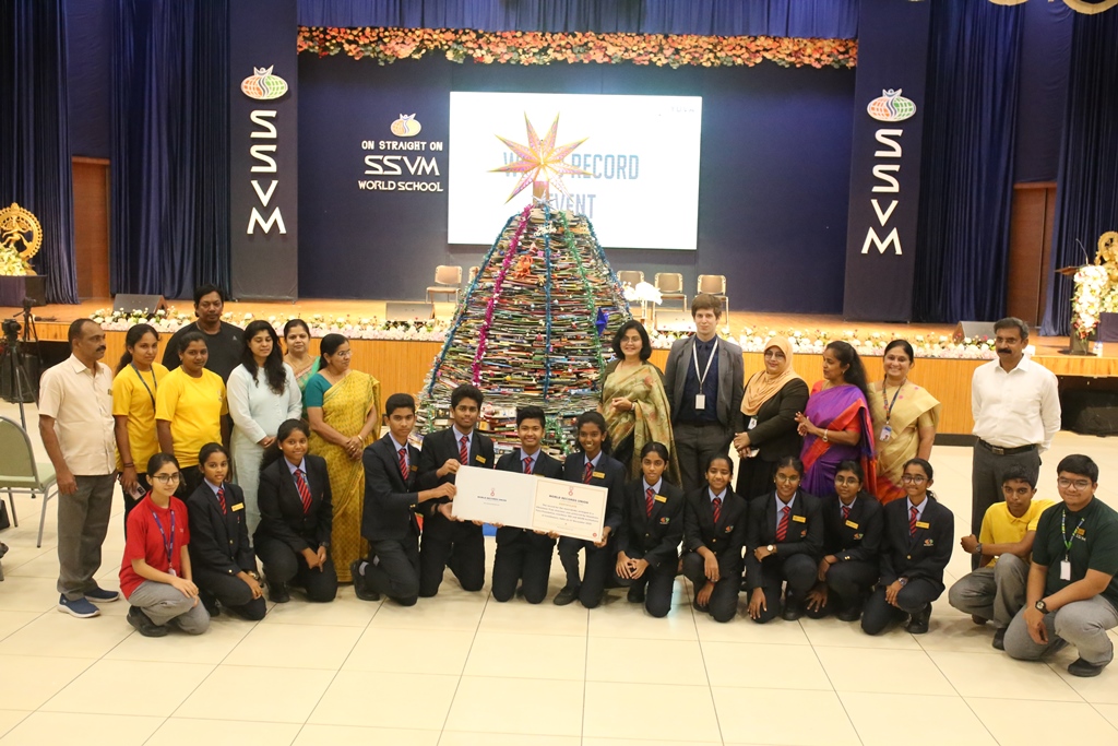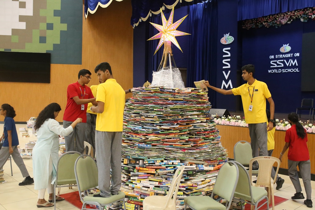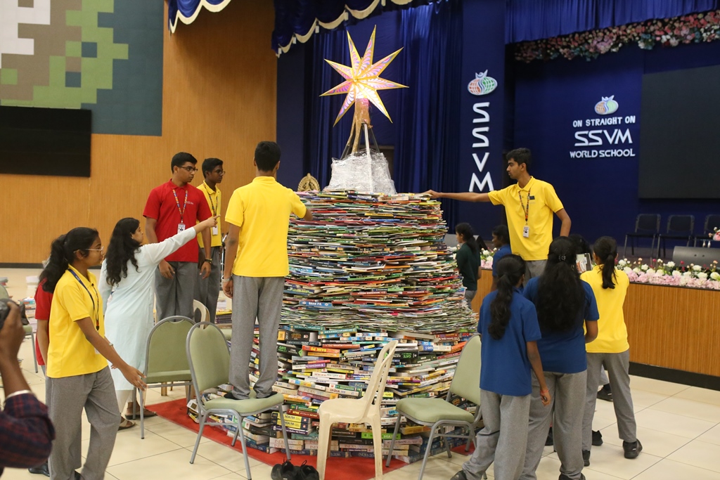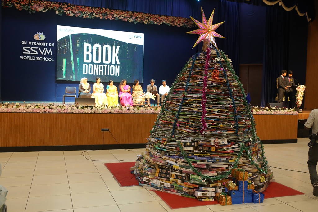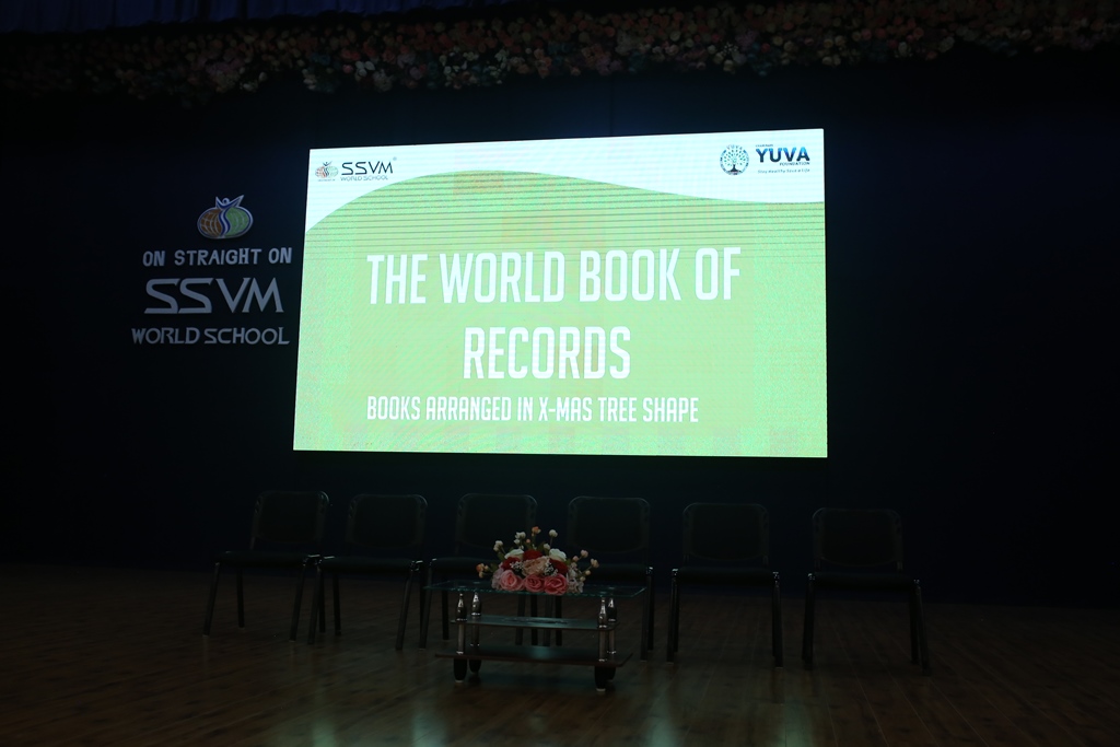 SSVM Institutions’ Yuva Club set a World Record Chirstofer Taylor Craft presents the record certificate to Manimekalai Mohan in the presence of Chandrans Yuva Foundation members and the student participants. Chandrans Yuva Foundation & Yuva Club students of SSVM World School came together to structure a 15 feet tall Christmas Tree look alike using 12,000 books in 1.5 hours and successfully set a World Record at the school premises.Chirstofer Taylor Craft from World Records Union, Florida judged the attempt and handed over the official world record certificate to the Yuva Club Students of the school in a ceremony.