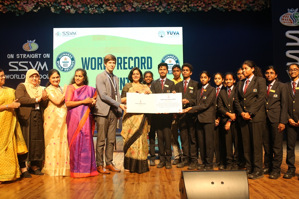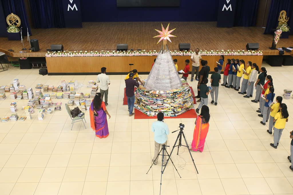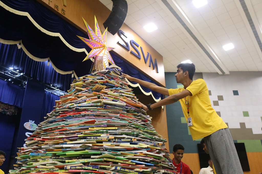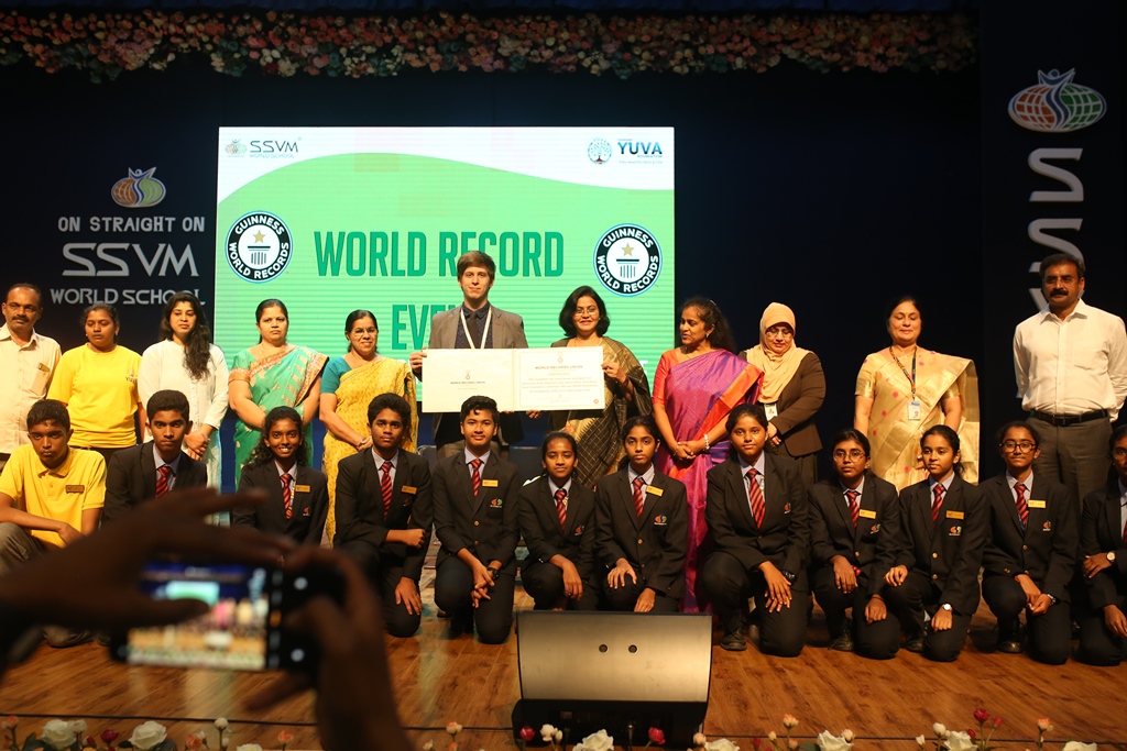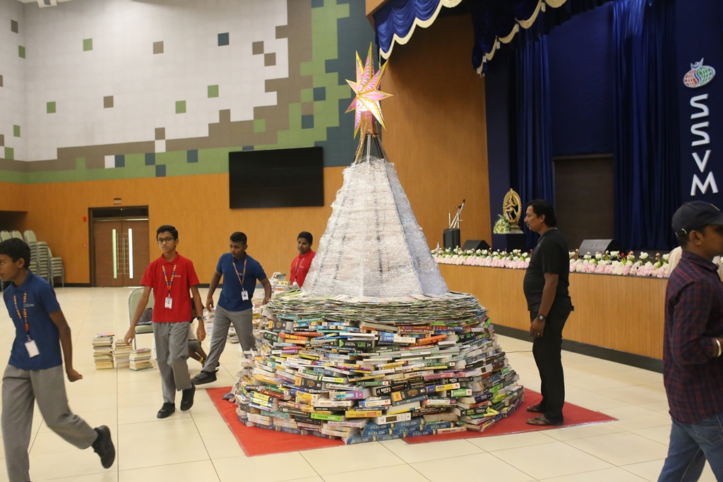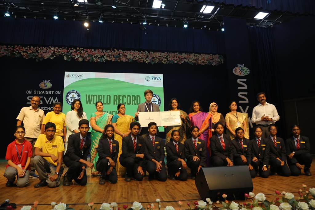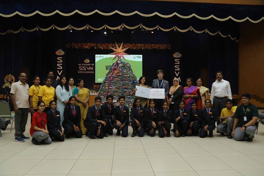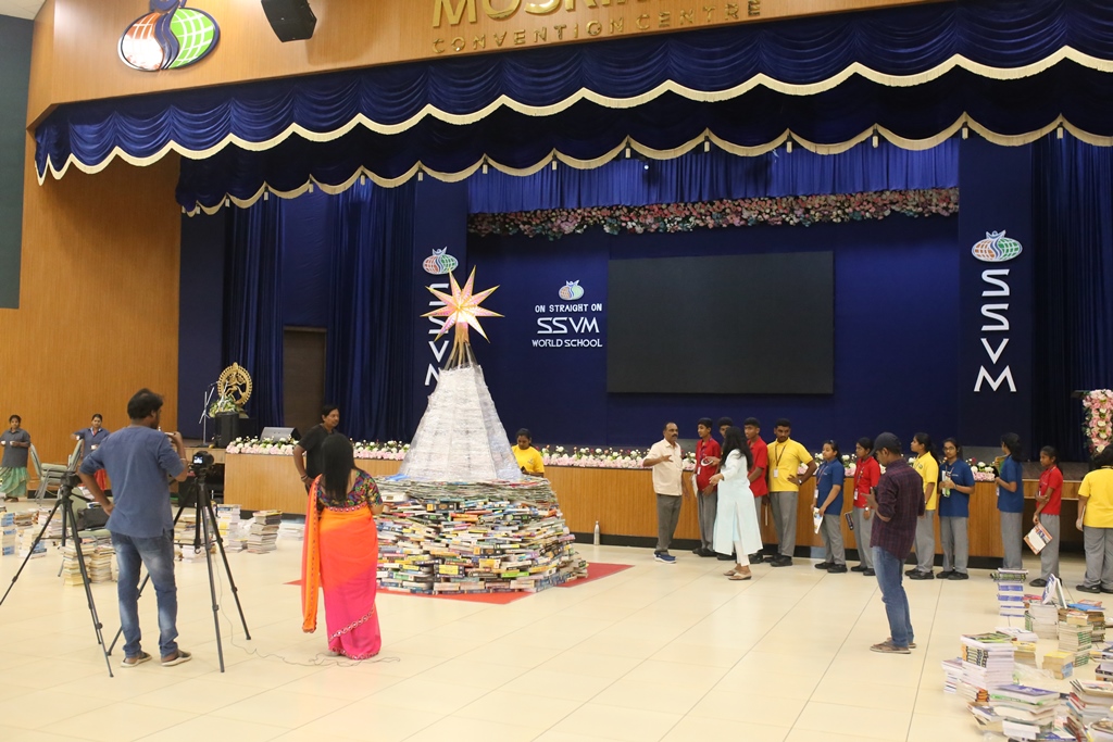SSVM Institutions’ Yuva Club set a World Record Chirstofer Taylor Craft presents the record certificate to Manimekalai Mohan in the presence of Chandrans Yuva Foundation members and the student participants. Chandrans Yuva Foundation & Yuva Club students of SSVM World School came together to structure a 15 feet tall Christmas Tree look alike using 12,000 books in 1.5 hours and successfully set a World Record at the school premises.Chirstofer Taylor Craft from World Records Union, Florida judged the attempt and handed over the official world record certificate to the Yuva Club Students of the school in a ceremony.