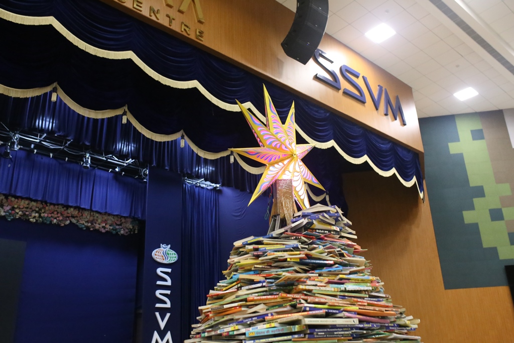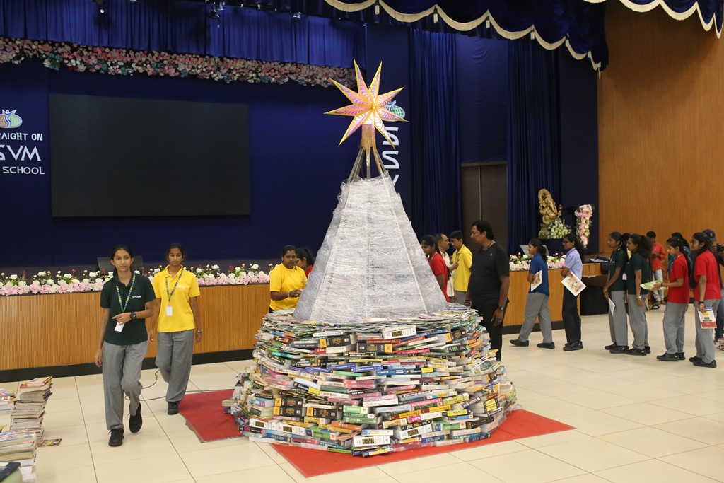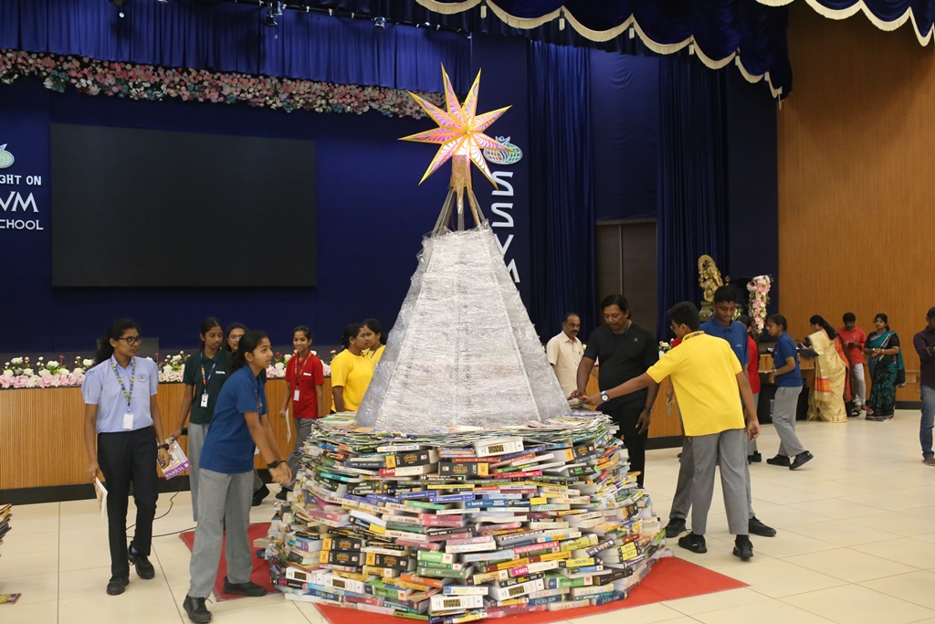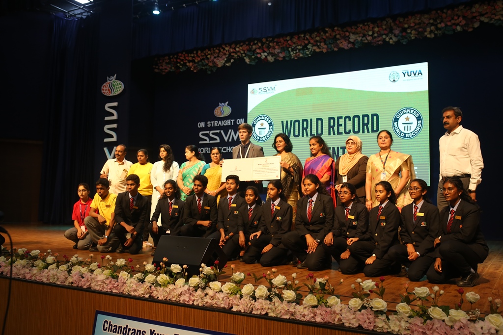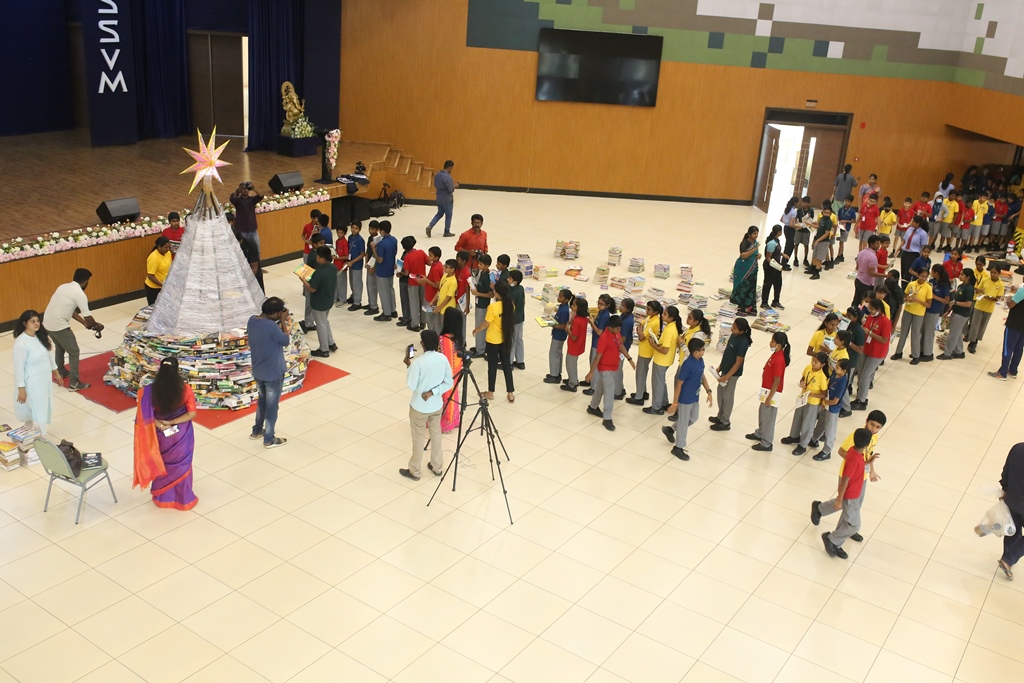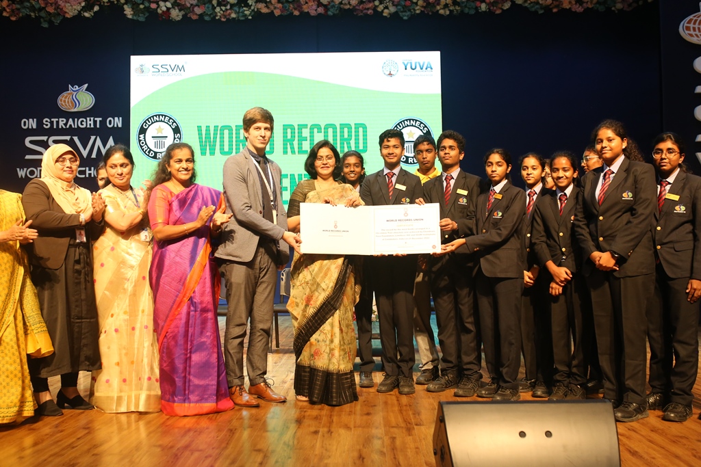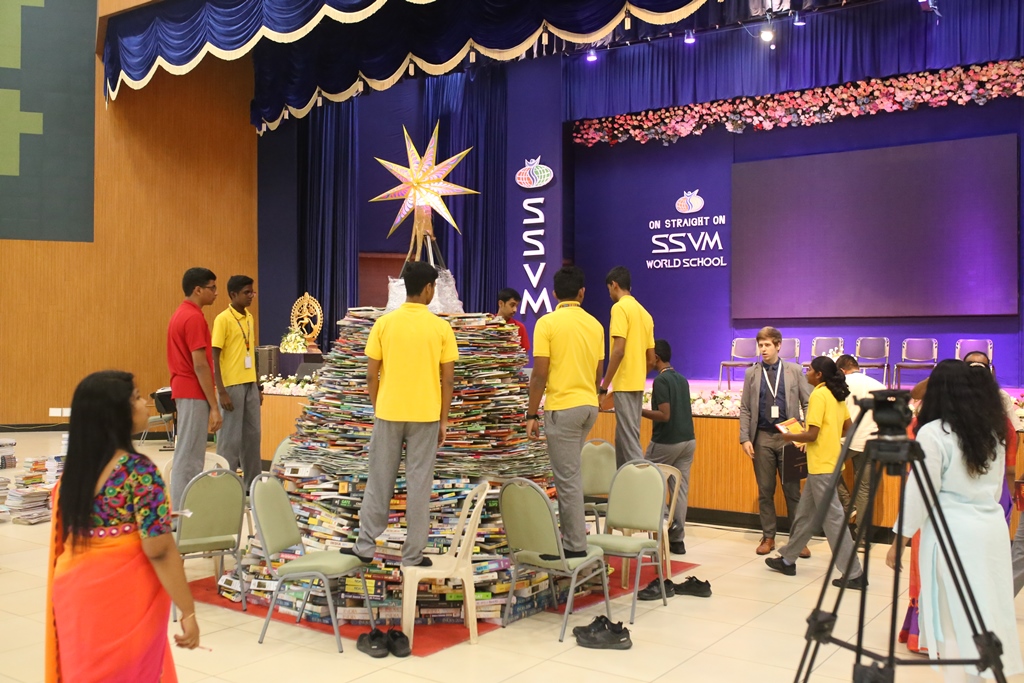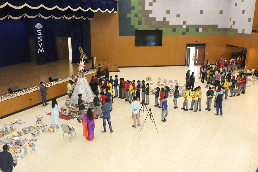 SSVM Institutions’ Yuva Club set a World Record Chirstofer Taylor Craft presents the record certificate to Manimekalai Mohan in the presence of Chandrans Yuva Foundation members and the student participants. Chandrans Yuva Foundation & Yuva Club students of SSVM World School came together to structure a 15 feet tall Christmas Tree look alike using 12,000 books in 1.5 hours and successfully set a World Record at the school premises.Chirstofer Taylor Craft from World Records Union, Florida judged the attempt and handed over the official world record certificate to the Yuva Club Students of the school in a ceremony.