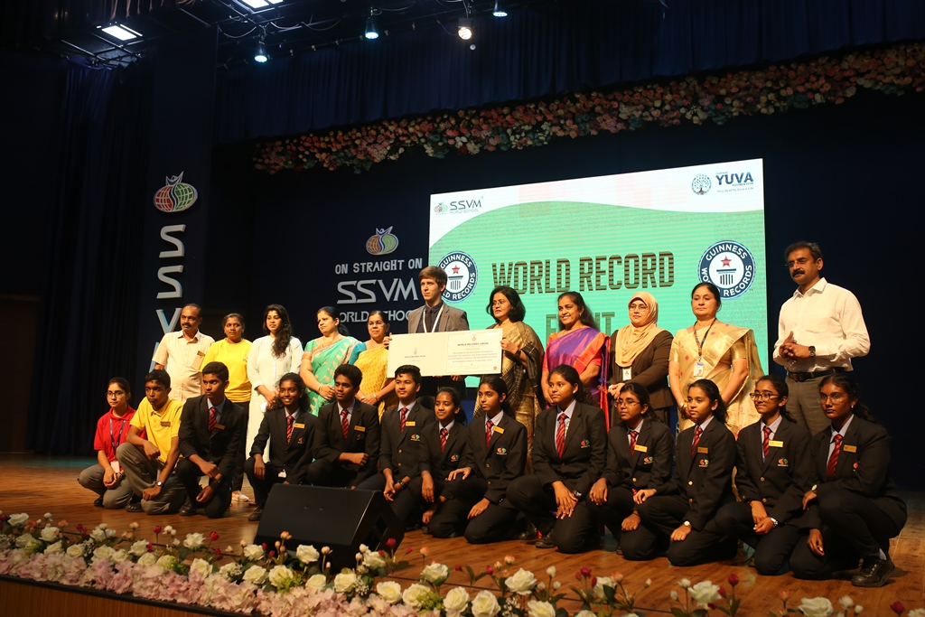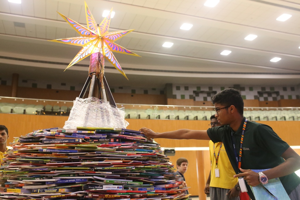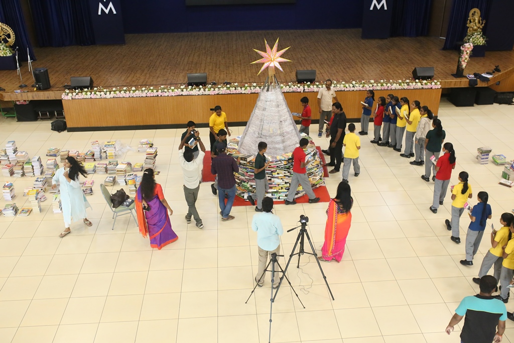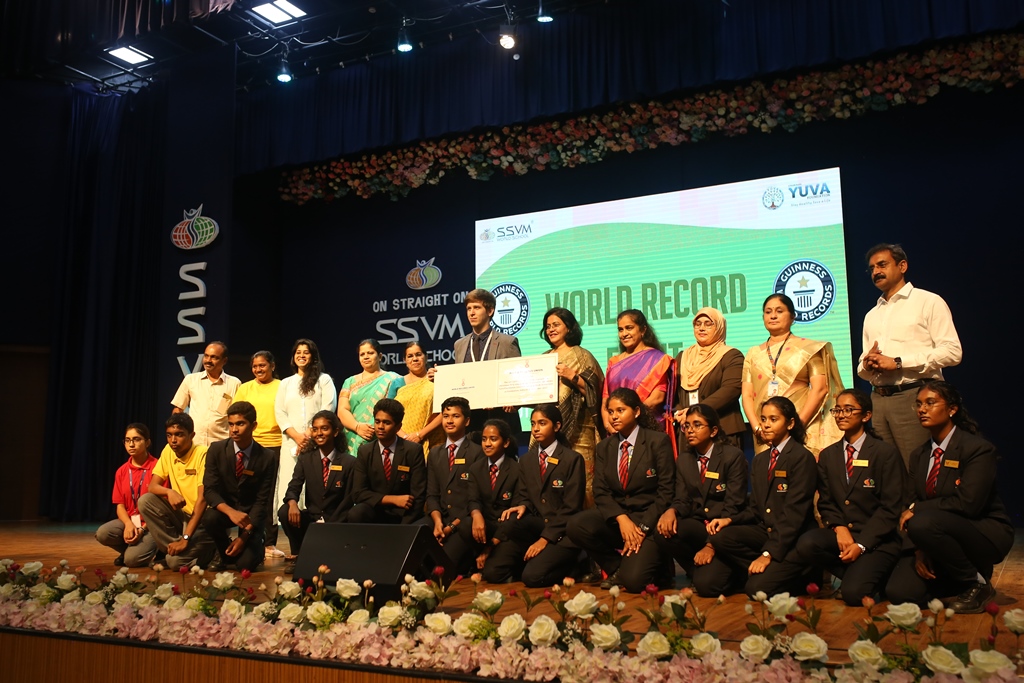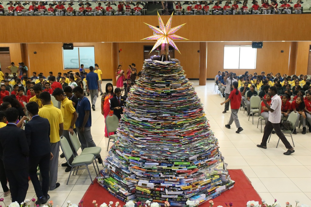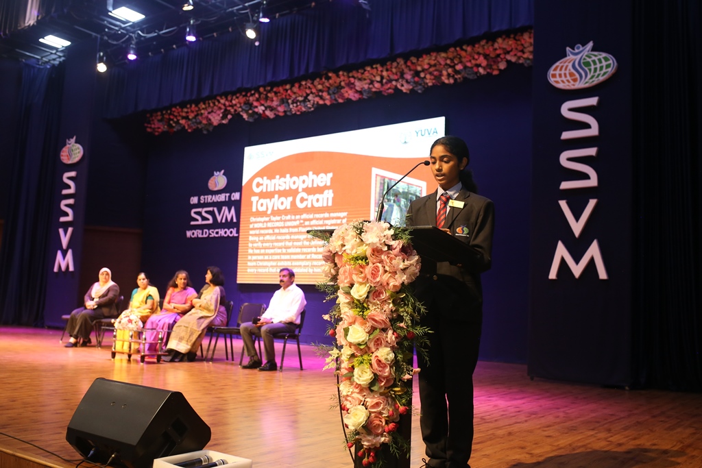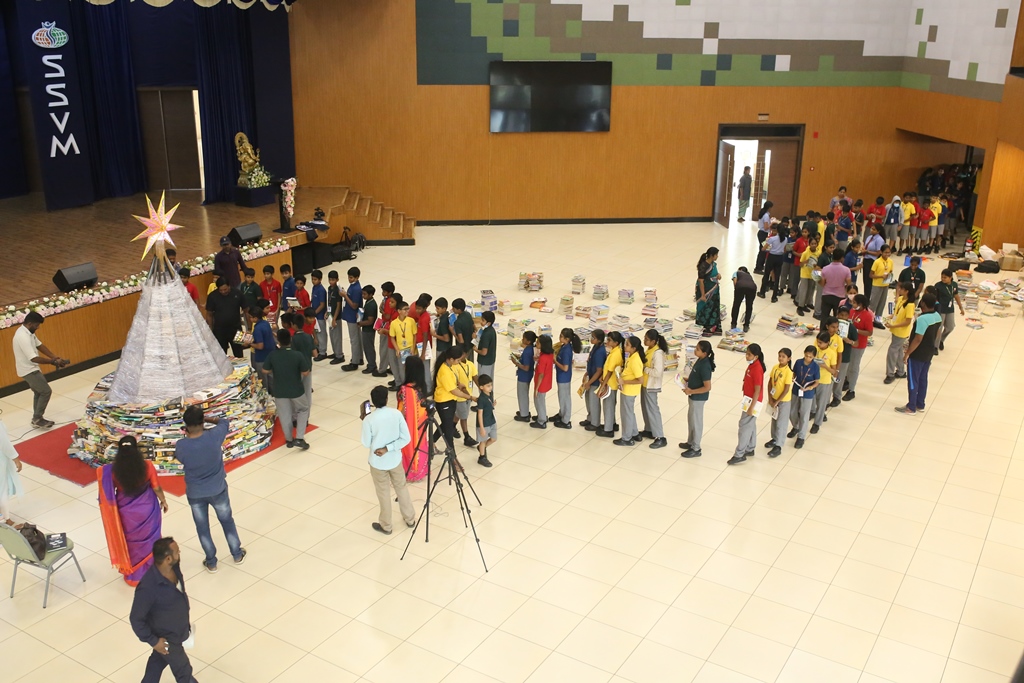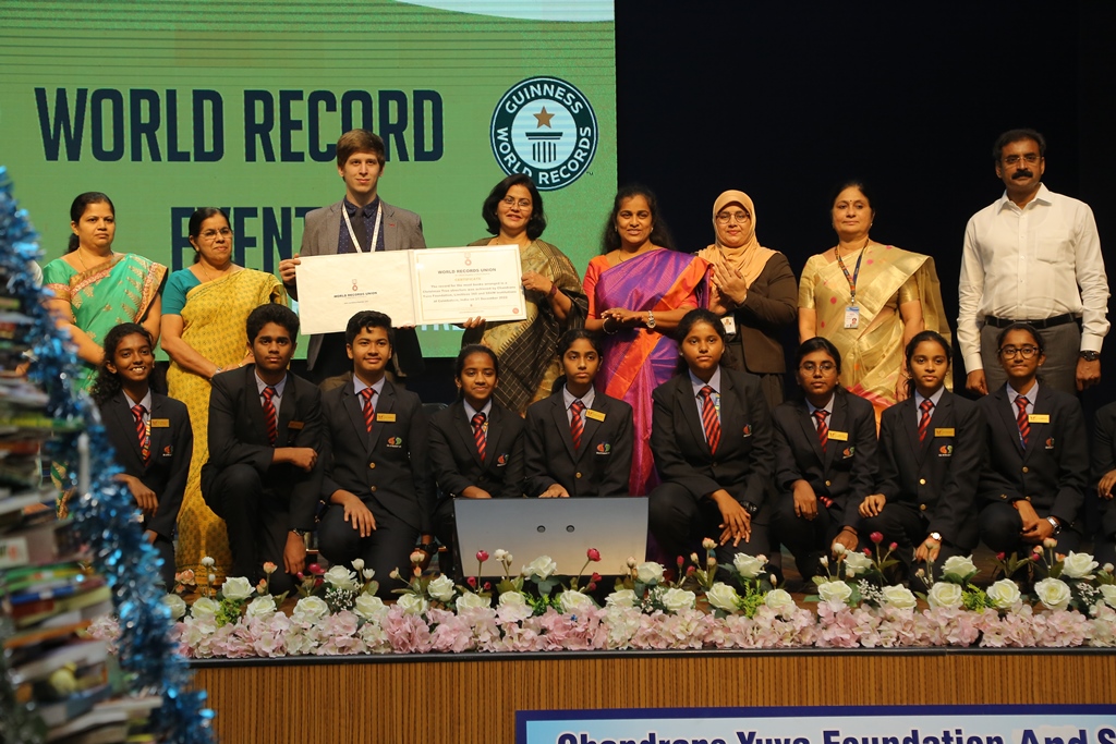 SSVM Institutions’ Yuva Club set a World Record Chirstofer Taylor Craft presents the record certificate to Manimekalai Mohan in the presence of Chandrans Yuva Foundation members and the student participants. Chandrans Yuva Foundation & Yuva Club students of SSVM World School came together to structure a 15 feet tall Christmas Tree look alike using 12,000 books in 1.5 hours and successfully set a World Record at the school premises.Chirstofer Taylor Craft from World Records Union, Florida judged the attempt and handed over the official world record certificate to the Yuva Club Students of the school in a ceremony.